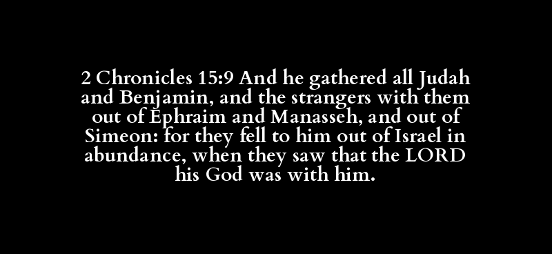 2 Chronicles 15:9 And he gathered all Judah and Benjamin, and the strangers with them out of Ephraim and Manasseh, and out of Simeon: for they fell to him out of Israel in abundance, when they saw that the LORD his God was with him.