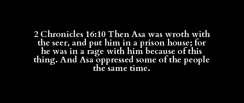 2 Chronicles 16:10 Then Asa was wroth with the seer, and put him in a prison house; for he was in a rage with him because of this thing. And Asa oppressed some of the people the same time.