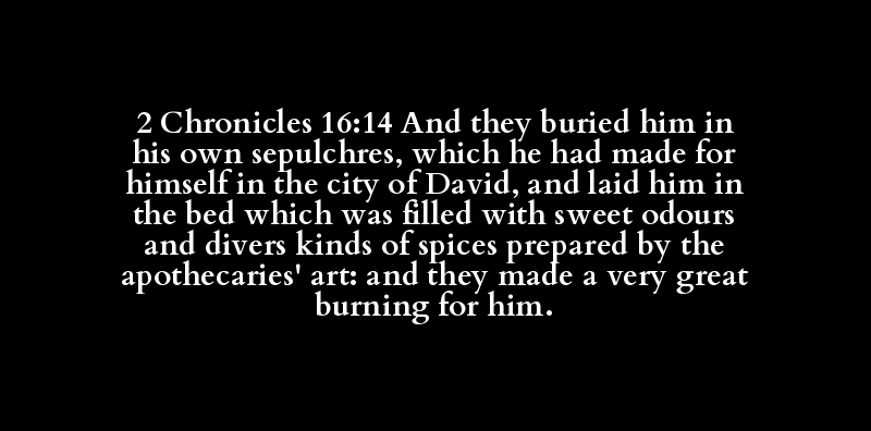 2 Chronicles 16:14 And they buried him in his own sepulchres, which he had made for himself in the city of David, and laid him in the bed which was filled with sweet odours and divers kinds of spices prepared by the apothecaries' art: and they made a very great burning for him.