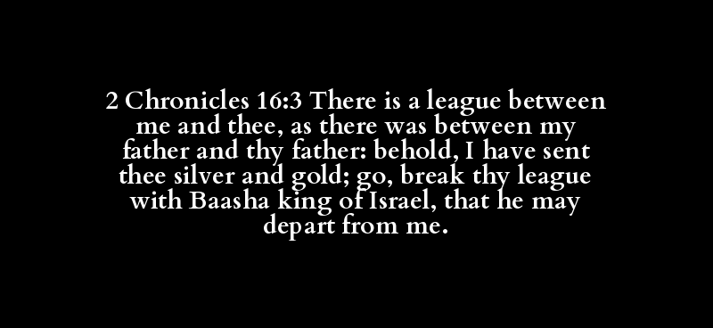 2 Chronicles 16:3 There is a league between me and thee, as there was between my father and thy father: behold, I have sent thee silver and gold; go, break thy league with Baasha king of Israel, that he may depart from me.
