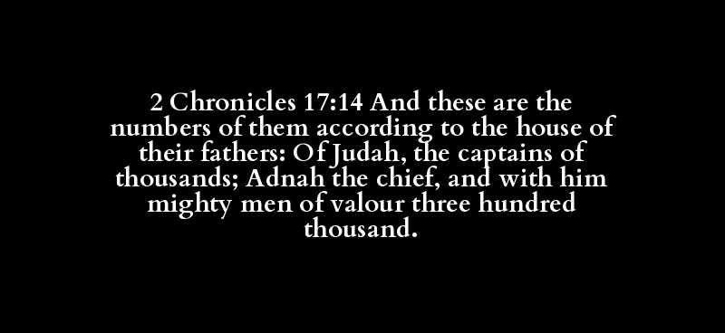 2 Chronicles 17:14 And these are the numbers of them according to the house of their fathers: Of Judah, the captains of thousands; Adnah the chief, and with him mighty men of valour three hundred thousand.
