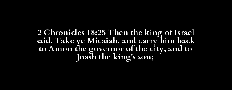 2 Chronicles 18:25 Then the king of Israel said, Take ye Micaiah, and carry him back to Amon the governor of the city, and to Joash the king's son;