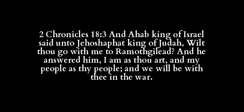 2 Chronicles 18:3 And Ahab king of Israel said unto Jehoshaphat king of Judah, Wilt thou go with me to Ramothgilead? And he answered him, I am as thou art, and my people as thy people; and we will be with thee in the war.
