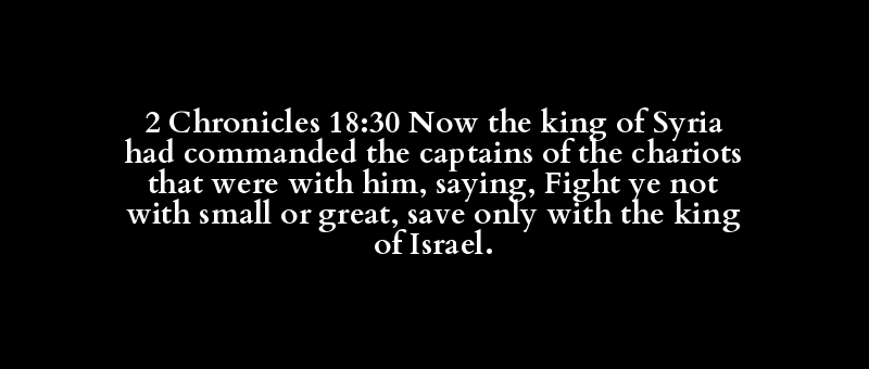 2 Chronicles 18:30 Now the king of Syria had commanded the captains of the chariots that were with him, saying, Fight ye not with small or great, save only with the king of Israel.