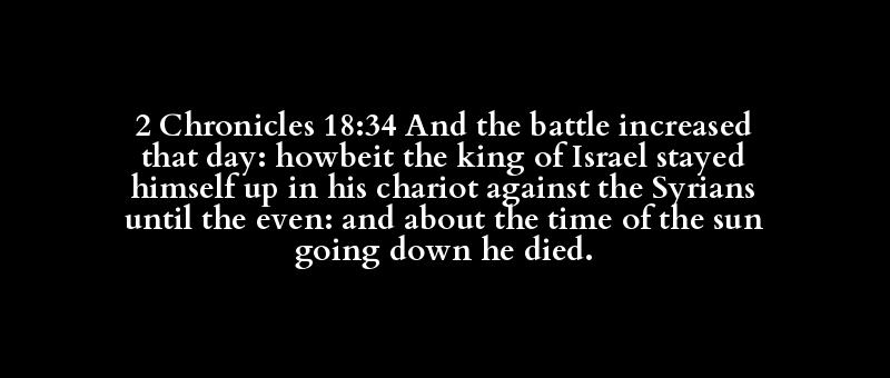 2 Chronicles 18:34 And the battle increased that day: howbeit the king of Israel stayed himself up in his chariot against the Syrians until the even: and about the time of the sun going down he died.