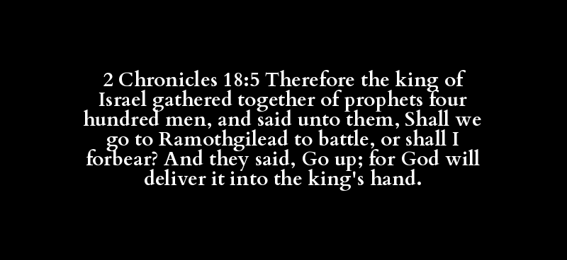 2 Chronicles 18:5 Therefore the king of Israel gathered together of prophets four hundred men, and said unto them, Shall we go to Ramothgilead to battle, or shall I forbear? And they said, Go up; for God will deliver it into the king's hand.