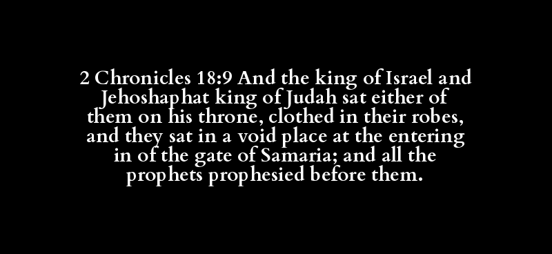 2 Chronicles 18:9 And the king of Israel and Jehoshaphat king of Judah sat either of them on his throne, clothed in their robes, and they sat in a void place at the entering in of the gate of Samaria; and all the prophets prophesied before them.