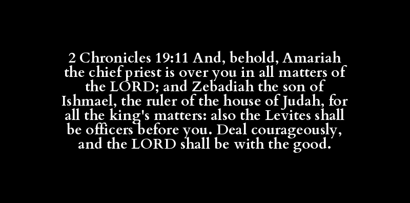 2 Chronicles 19:11 And, behold, Amariah the chief priest is over you in all matters of the LORD; and Zebadiah the son of Ishmael, the ruler of the house of Judah, for all the king's matters: also the Levites shall be officers before you. Deal courageously, and the LORD shall be with the good.