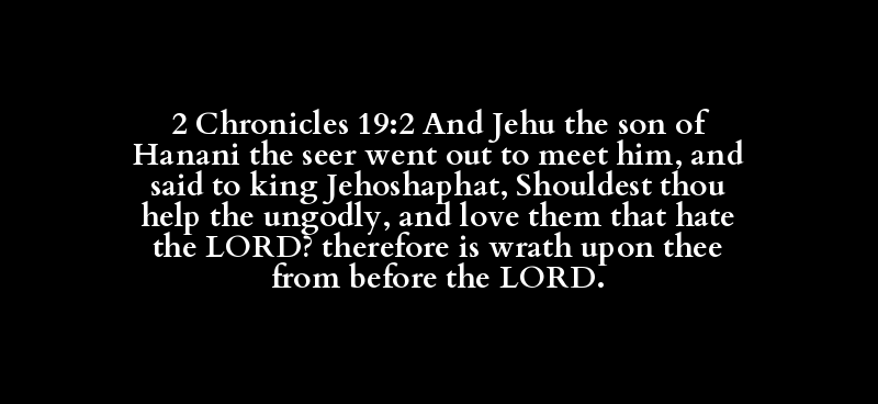 2 Chronicles 19:2 And Jehu the son of Hanani the seer went out to meet him, and said to king Jehoshaphat, Shouldest thou help the ungodly, and love them that hate the LORD? therefore is wrath upon thee from before the LORD.