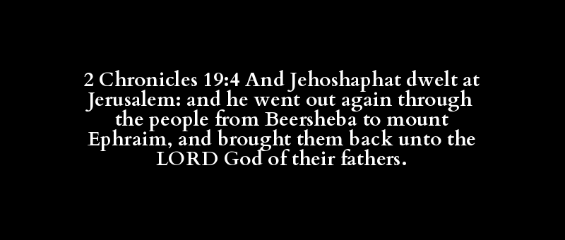 2 Chronicles 19:4 And Jehoshaphat dwelt at Jerusalem: and he went out again through the people from Beersheba to mount Ephraim, and brought them back unto the LORD God of their fathers.