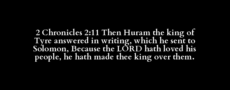 2 Chronicles 2:11 Then Huram the king of Tyre answered in writing, which he sent to Solomon, Because the LORD hath loved his people, he hath made thee king over them.