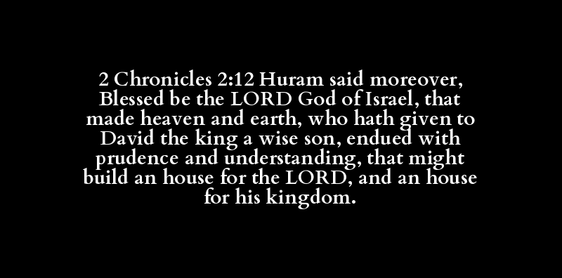 2 Chronicles 2:12 Huram said moreover, Blessed be the LORD God of Israel, that made heaven and earth, who hath given to David the king a wise son, endued with prudence and understanding, that might build an house for the LORD, and an house for his kingdom.
