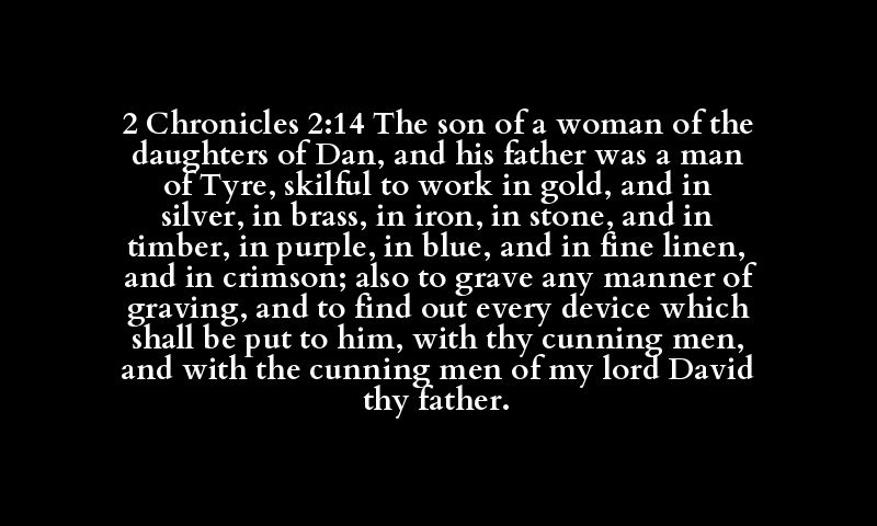 2 Chronicles 2:14 The son of a woman of the daughters of Dan, and his father was a man of Tyre, skilful to work in gold, and in silver, in brass, in iron, in stone, and in timber, in purple, in blue, and in fine linen, and in crimson; also to grave any manner of graving, and to find out every device which shall be put to him, with thy cunning men, and with the cunning men of my lord David thy father.
