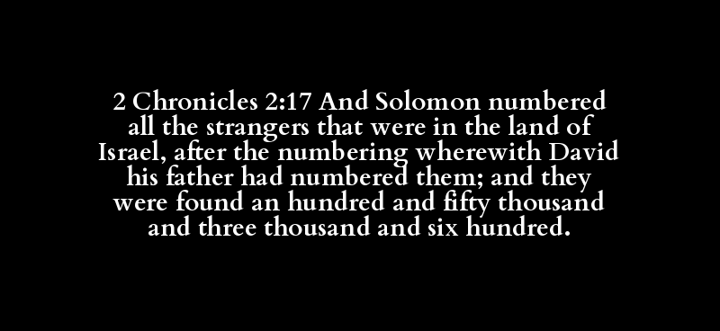2 Chronicles 2:17 And Solomon numbered all the strangers that were in the land of Israel, after the numbering wherewith David his father had numbered them; and they were found an hundred and fifty thousand and three thousand and six hundred.