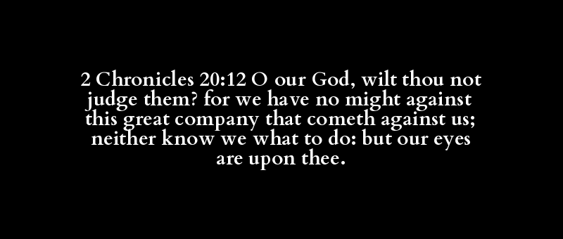 2 Chronicles 20:12 O our God, wilt thou not judge them? for we have no might against this great company that cometh against us; neither know we what to do: but our eyes are upon thee.