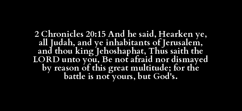 2 Chronicles 20:15 And he said, Hearken ye, all Judah, and ye inhabitants of Jerusalem, and thou king Jehoshaphat, Thus saith the LORD unto you, Be not afraid nor dismayed by reason of this great multitude; for the battle is not yours, but God's.