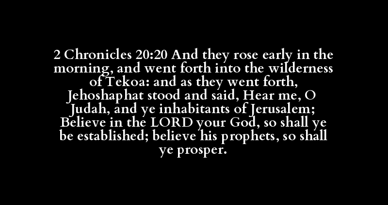 2 Chronicles 20:20 And they rose early in the morning, and went forth into the wilderness of Tekoa: and as they went forth, Jehoshaphat stood and said, Hear me, O Judah, and ye inhabitants of Jerusalem; Believe in the LORD your God, so shall ye be established; believe his prophets, so shall ye prosper.