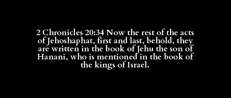 2 Chronicles 20:34 Now the rest of the acts of Jehoshaphat, first and last, behold, they are written in the book of Jehu the son of Hanani, who is mentioned in the book of the kings of Israel.