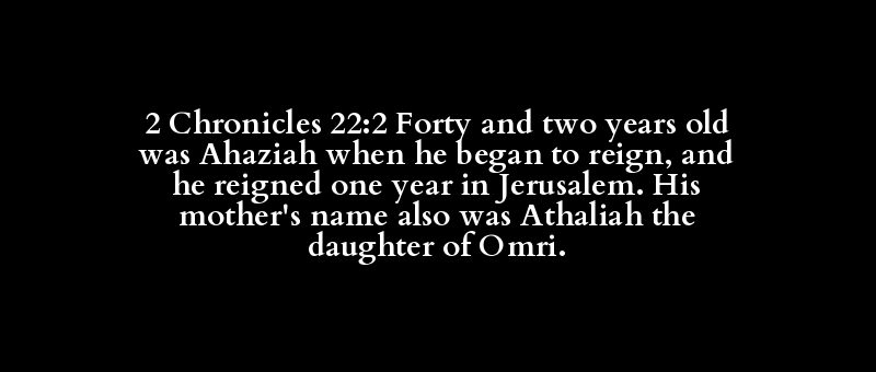 2 Chronicles 22:2 Forty and two years old was Ahaziah when he began to reign, and he reigned one year in Jerusalem. His mother's name also was Athaliah the daughter of Omri.