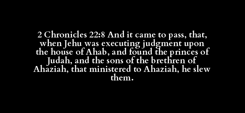 2 Chronicles 22:8 And it came to pass, that, when Jehu was executing judgment upon the house of Ahab, and found the princes of Judah, and the sons of the brethren of Ahaziah, that ministered to Ahaziah, he slew them.