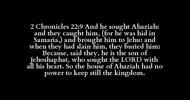 2 Chronicles 22:9 And he sought Ahaziah: and they caught him, (for he was hid in Samaria,) and brought him to Jehu: and when they had slain him, they buried him: Because, said they, he is the son of Jehoshaphat, who sought the LORD with all his heart. So the house of Ahaziah had no power to keep still the kingdom.