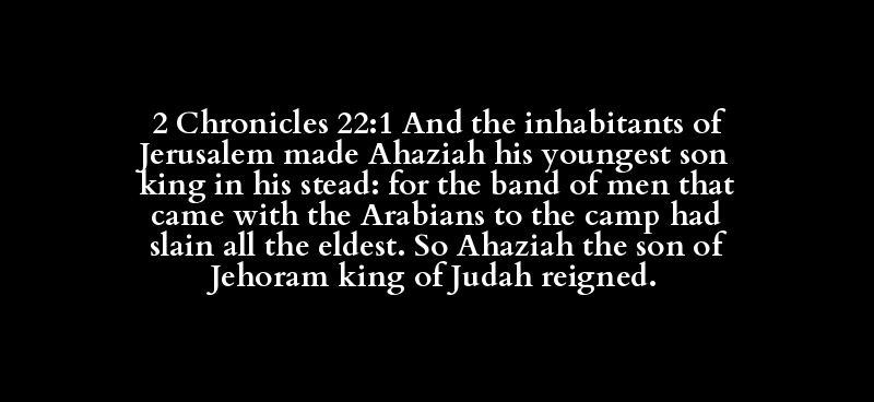 2 Chronicles 22:1 And the inhabitants of Jerusalem made Ahaziah his youngest son king in his stead: for the band of men that came with the Arabians to the camp had slain all the eldest. So Ahaziah the son of Jehoram king of Judah reigned.