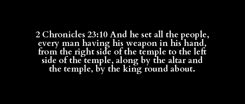 2 Chronicles 23:10 And he set all the people, every man having his weapon in his hand, from the right side of the temple to the left side of the temple, along by the altar and the temple, by the king round about.