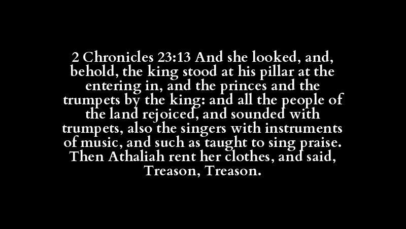 2 Chronicles 23:13 And she looked, and, behold, the king stood at his pillar at the entering in, and the princes and the trumpets by the king: and all the people of the land rejoiced, and sounded with trumpets, also the singers with instruments of music, and such as taught to sing praise. Then Athaliah rent her clothes, and said, Treason, Treason.