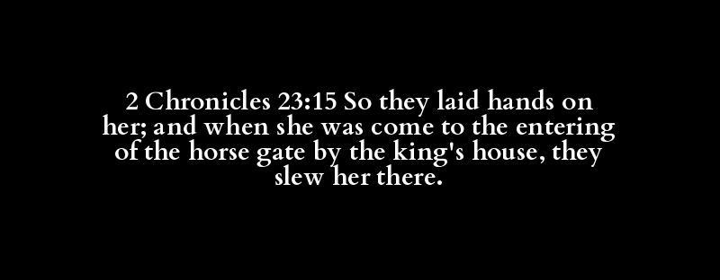 2 Chronicles 23:15 So they laid hands on her; and when she was come to the entering of the horse gate by the king's house, they slew her there.