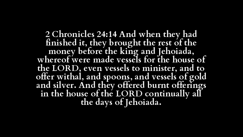 2 Chronicles 24:14 And when they had finished it, they brought the rest of the money before the king and Jehoiada, whereof were made vessels for the house of the LORD, even vessels to minister, and to offer withal, and spoons, and vessels of gold and silver. And they offered burnt offerings in the house of the LORD continually all the days of Jehoiada.