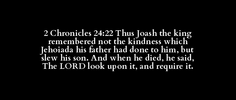 2 Chronicles 24:22 Thus Joash the king remembered not the kindness which Jehoiada his father had done to him, but slew his son. And when he died, he said, The LORD look upon it, and require it.