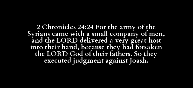 2 Chronicles 24:24 For the army of the Syrians came with a small company of men, and the LORD delivered a very great host into their hand, because they had forsaken the LORD God of their fathers. So they executed judgment against Joash.