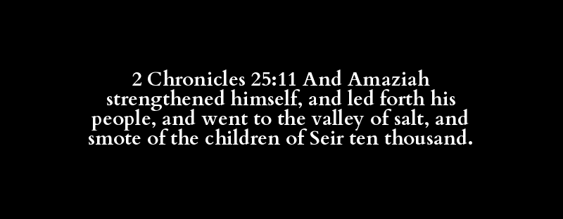 2 Chronicles 25:11 And Amaziah strengthened himself, and led forth his people, and went to the valley of salt, and smote of the children of Seir ten thousand.