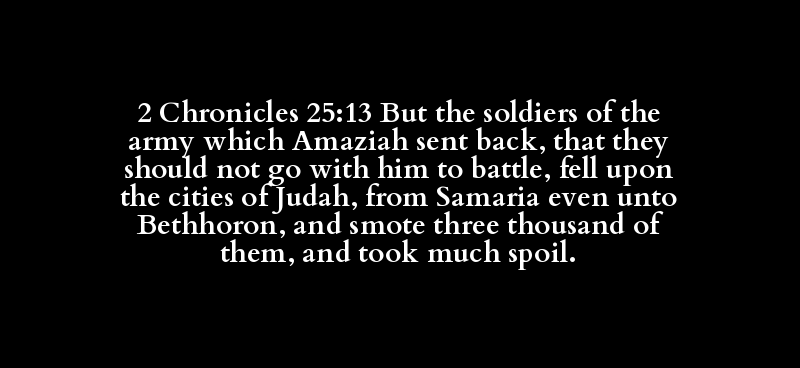 2 Chronicles 25:13 But the soldiers of the army which Amaziah sent back, that they should not go with him to battle, fell upon the cities of Judah, from Samaria even unto Bethhoron, and smote three thousand of them, and took much spoil.