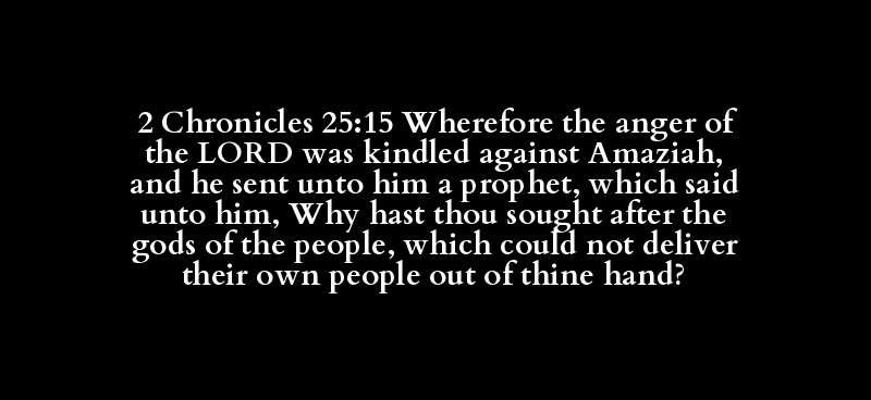 2 Chronicles 25:15 Wherefore the anger of the LORD was kindled against Amaziah, and he sent unto him a prophet, which said unto him, Why hast thou sought after the gods of the people, which could not deliver their own people out of thine hand?