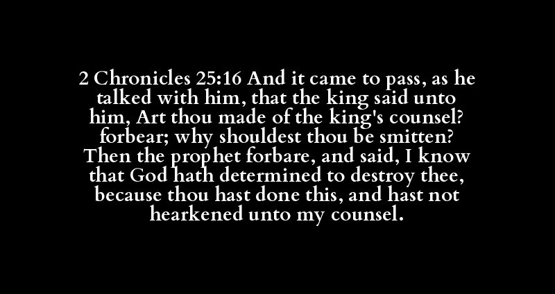 2 Chronicles 25:16 And it came to pass, as he talked with him, that the king said unto him, Art thou made of the king's counsel? forbear; why shouldest thou be smitten? Then the prophet forbare, and said, I know that God hath determined to destroy thee, because thou hast done this, and hast not hearkened unto my counsel.