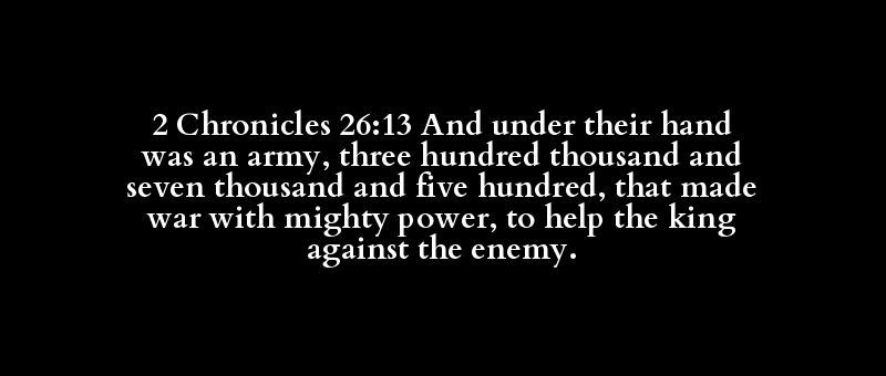 2 Chronicles 26:13 And under their hand was an army, three hundred thousand and seven thousand and five hundred, that made war with mighty power, to help the king against the enemy.