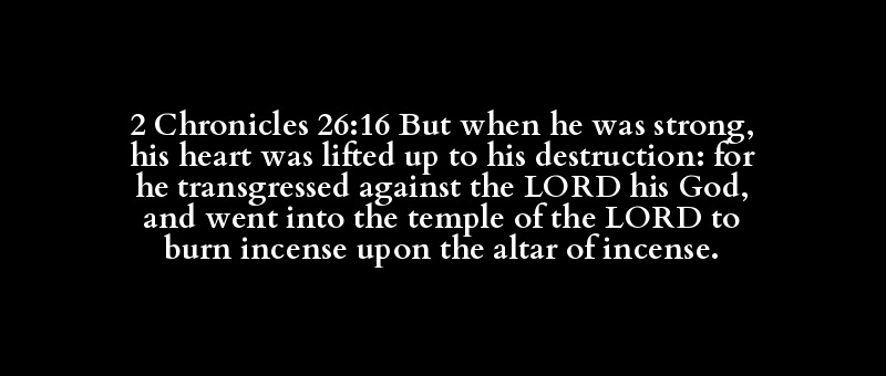 2 Chronicles 26:16 But when he was strong, his heart was lifted up to his destruction: for he transgressed against the LORD his God, and went into the temple of the LORD to burn incense upon the altar of incense.