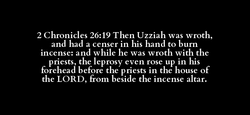 2 Chronicles 26:19 Then Uzziah was wroth, and had a censer in his hand to burn incense: and while he was wroth with the priests, the leprosy even rose up in his forehead before the priests in the house of the LORD, from beside the incense altar.
