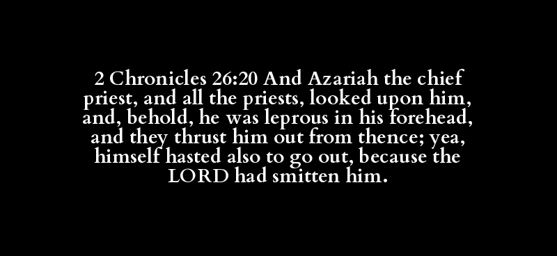 2 Chronicles 26:20 And Azariah the chief priest, and all the priests, looked upon him, and, behold, he was leprous in his forehead, and they thrust him out from thence; yea, himself hasted also to go out, because the LORD had smitten him.