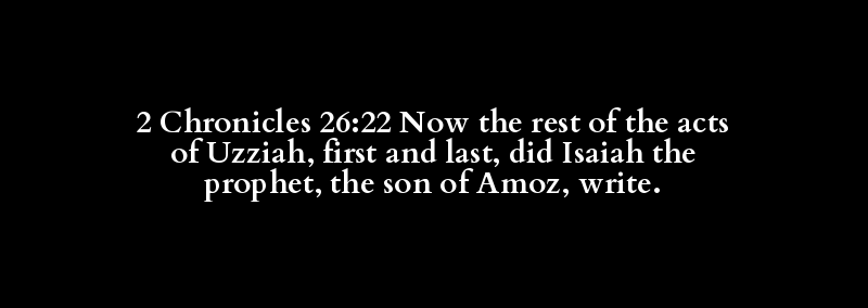 2 Chronicles 26:22 Now the rest of the acts of Uzziah, first and last, did Isaiah the prophet, the son of Amoz, write.
