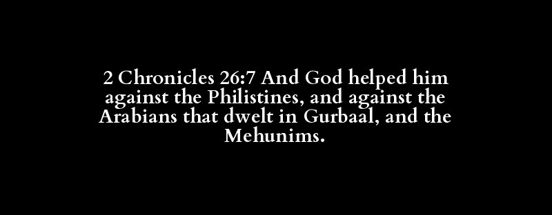 2 Chronicles 26:7 And God helped him against the Philistines, and against the Arabians that dwelt in Gurbaal, and the Mehunims.