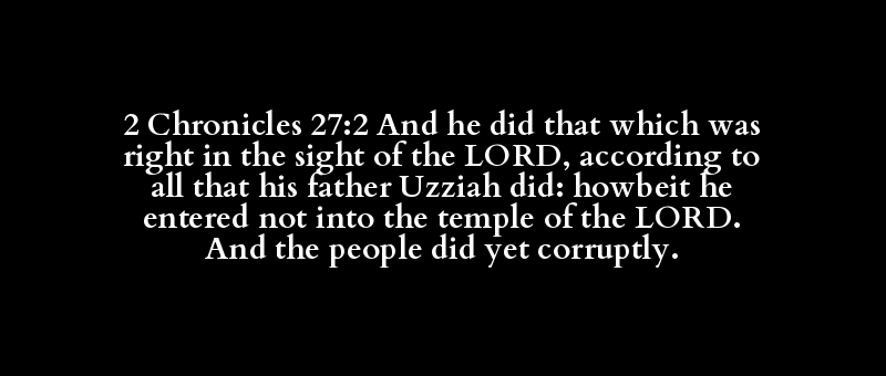2 Chronicles 27:2 And he did that which was right in the sight of the LORD, according to all that his father Uzziah did: howbeit he entered not into the temple of the LORD. And the people did yet corruptly.