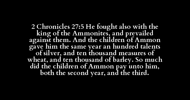 2 Chronicles 27:5 He fought also with the king of the Ammonites, and prevailed against them. And the children of Ammon gave him the same year an hundred talents of silver, and ten thousand measures of wheat, and ten thousand of barley. So much did the children of Ammon pay unto him, both the second year, and the third.