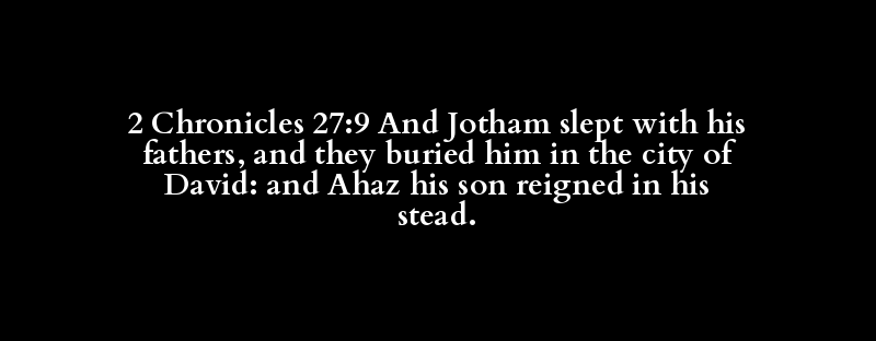 2 Chronicles 27:9 And Jotham slept with his fathers, and they buried him in the city of David: and Ahaz his son reigned in his stead.