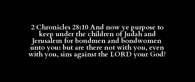 2 Chronicles 28:10 And now ye purpose to keep under the children of Judah and Jerusalem for bondmen and bondwomen unto you: but are there not with you, even with you, sins against the LORD your God?