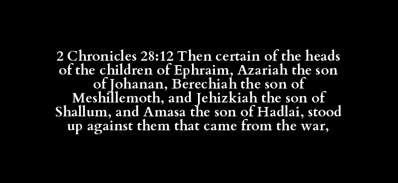 2 Chronicles 28:12 Then certain of the heads of the children of Ephraim, Azariah the son of Johanan, Berechiah the son of Meshillemoth, and Jehizkiah the son of Shallum, and Amasa the son of Hadlai, stood up against them that came from the war,