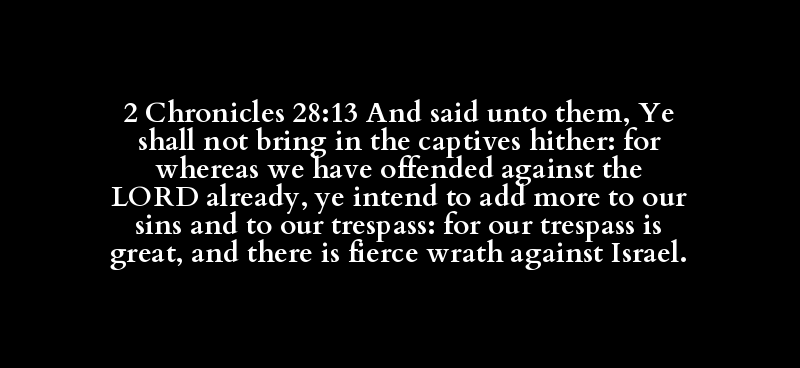 2 Chronicles 28:13 And said unto them, Ye shall not bring in the captives hither: for whereas we have offended against the LORD already, ye intend to add more to our sins and to our trespass: for our trespass is great, and there is fierce wrath against Israel.