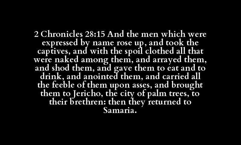 2 Chronicles 28:15 And the men which were expressed by name rose up, and took the captives, and with the spoil clothed all that were naked among them, and arrayed them, and shod them, and gave them to eat and to drink, and anointed them, and carried all the feeble of them upon asses, and brought them to Jericho, the city of palm trees, to their brethren: then they returned to Samaria.
