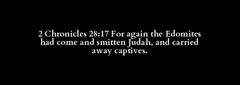 2 Chronicles 28:17 For again the Edomites had come and smitten Judah, and carried away captives.